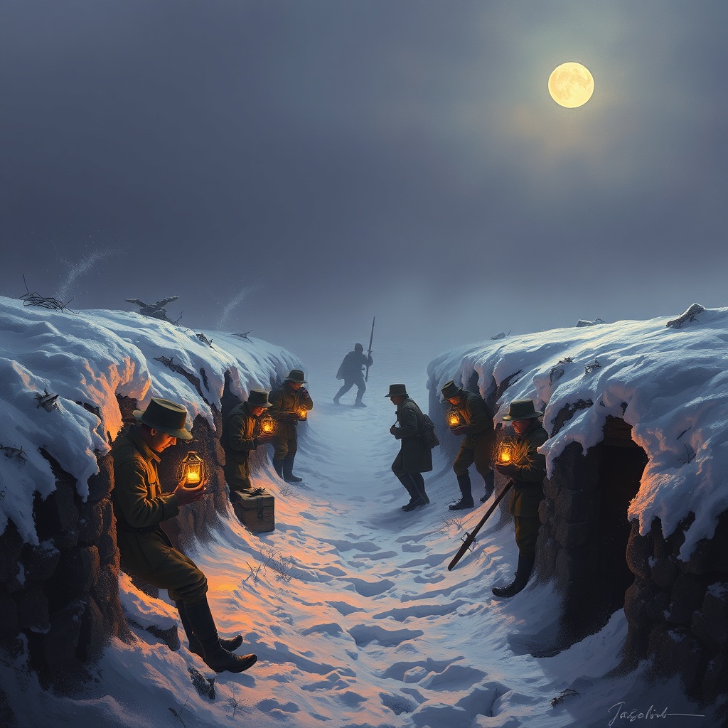 On Christmas Eve, December 24th, a cold wind swept across the frozen front lines. And then it happened. From the German trenches in the darkness, familiar carol sounds began to drift over: "Stille Nacht, Heilige Nacht..." (Silent Night, Holy Night). At first, the British soldiers were cautious, but soon they, too, began to sing carols from their own trenches. Moments later, small Christmas trees, lit up, appeared above the German trenches, and "Merry Christmas!" in broken English and German shouts cut through the darkness. The gunfire ceased, and a strange excitement, rather than tension, filled the front line.